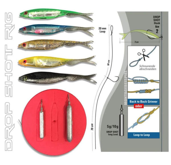 Met deze Jenzi Complete Drop Shot Set ben je direct klaar om op jacht te gaan naar een mooie baars of snoekbaars! Knoop de leader aan de hoofdlijn, kies het gewenste loodgewicht en monteer je softbait aan de vlijmscherpe haak. Deze complete set is bevat 2 loodjes, 2 leaders met aangeknoopte haken en 5 verschillende softbaits van 7cm.